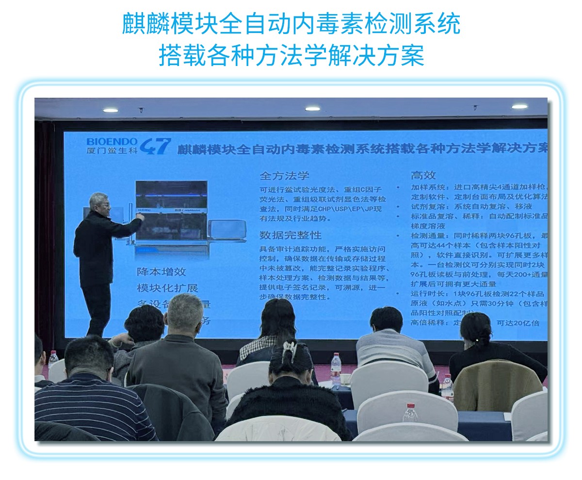 廈門鱟生科吳尚毅董事長在會議上介紹了“智檢未來+重組替代”的可持續(xù)發(fā)展內(nèi)毒素檢測全面解決方案報告。展示了廈門鱟生科47年專注鱟試劑、內(nèi)毒素檢測領(lǐng)域的發(fā)展歷程及成果,介紹了我司檢測試劑+檢測設(shè)備+專業(yè)軟件+重組試劑+全自動智能機器人+體系驗證全面解決方案的產(chǎn)業(yè)化升級,從傳統(tǒng)鱟試劑轉(zhuǎn)型升級為AI+合成生物學(xué)領(lǐng)先企業(yè),保護鱟資源,實現(xiàn)可持續(xù)發(fā)展的戰(zhàn)略規(guī)劃,努力建設(shè)符合國家發(fā)展政策的高質(zhì)量新質(zhì)生產(chǎn)力企業(yè),助力我國醫(yī)藥行業(yè)發(fā)展。